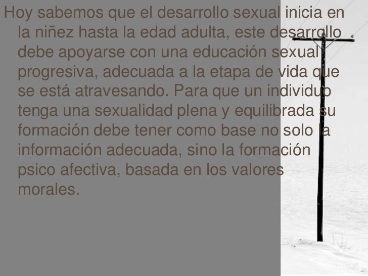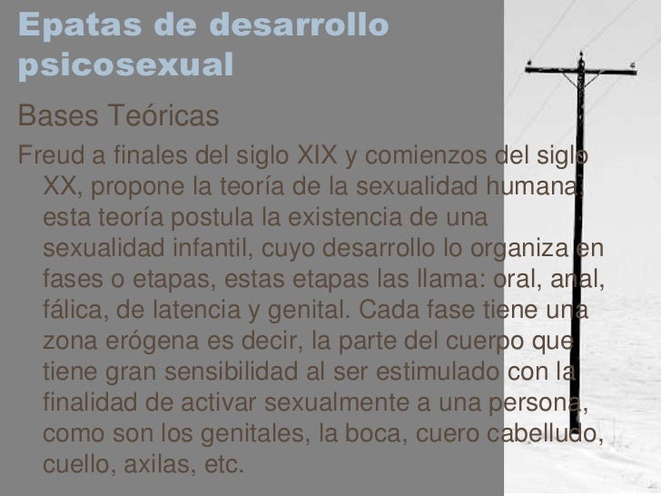 Freud a finales del siglo XIX y comienzos del siglo XX, propone la teoría de la sexualidad humana, esta teoría postula la existencia de una sexualidad infantil, cuyo desarrollo lo organiza en fases o etapas, estas etapas las llama: oral, anal, fálica, de latencia y genital. Cada fase tiene una zona erógena es decir, la parte del cuerpo que tiene gran sensibilidad al ser estimulado con la finalidad de activar sexualmente a una persona, como son los genitales, la boca, cuero cabelludo, cuello, axilas, etc. - 4. Hoy sabemos que el desarrollo sexual inicia en la niñez hasta la edad adulta, este desarrollo debe apoyarse con una educación sexual progresiva, adecuada a la etapa de vida que se está atravesando. Para que un individuo tenga una sexualidad plena y equilibrada su formación debe tener como base no solo la información adecuada, sino la formación psico afectiva, basada en los valores morales.