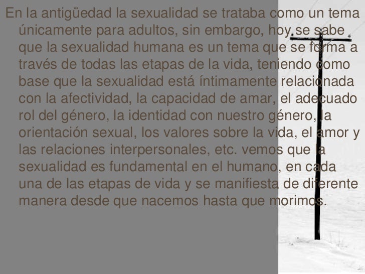 - 5. En la antigüedad la sexualidad se trataba como un tema únicamente para adultos, sin embargo, hoy se sabe que la sexualidad humana es un tema que se forma a través de todas las etapas de la vida, teniendo como base que la sexualidad está íntimamente relacionada con la afectividad, la capacidad de amar, el adecuado rol del género, la identidad con nuestro género, la orientación sexual, los valores sobre la vida, el amor y las relaciones interpersonales, etc. vemos que la sexualidad es fundamental en el humano, en cada una de las etapas de vida y se manifiesta de diferente manera desde que nacemos hasta que morimos.