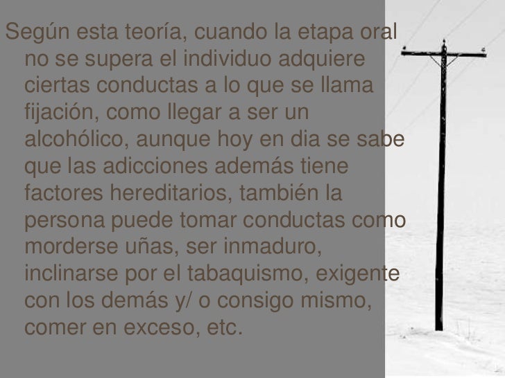 Etapa OralEl niño desde que nace siente placer al ser amamantado, convirtiéndose la boca el centro de placer o zona erógena, esta parte de su cuerpo le proporciona satisfacción, agrado y acercamiento hacia la madre. En los siguientes meses será capaz de sentir emociones diferentes como cólera, alegría, acercamiento y obtener placer a través de la alimentación.Como vemos en la etapa oral, la boca es el centro del placer en el ser humano, es común observar que en la primera etapa de la vida el niño se lleve fácilmente objetos a la boca, así como diferentes partes del cuerpo, como las manos y los pies. Además inicia la etapa de conocer su propio cuerpo y obtener autosatisfacción. - 7. Según esta teoría, cuando la etapa oral no se supera el individuo adquiere ciertas conductas a lo que se llama fijación, como llegar a ser un alcohólico, aunque hoy en dia se sabe que las adicciones además tiene factores hereditarios, también la persona puede tomar conductas como morderse uñas, ser inmaduro, inclinarse por el tabaquismo, exigente con los demás y/ o consigo mismo, comer en exceso, etc.