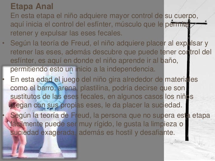 Según la teoría de Freud, el niño adquiere placer al expulsar y retener las eses, además descubre que puede tener control del esfínter, es aquí en donde el niño aprende ir al baño, permitiendo esto un inicio a la independencia.